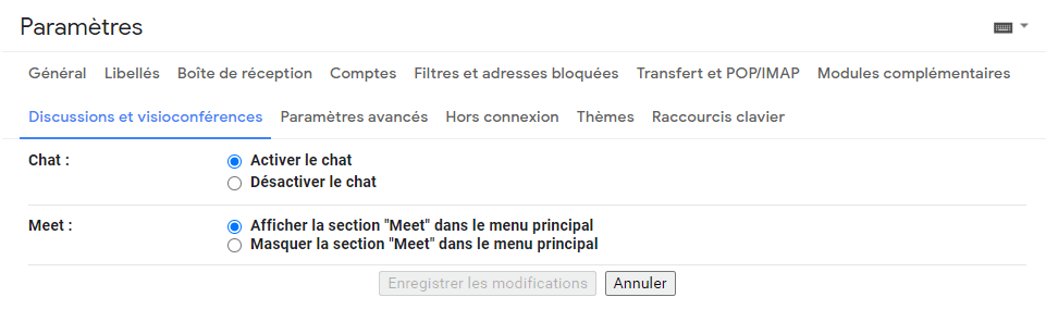 Nouveau paramètre utilisateur pour masquer ou afficher Google Meet dans Gmail